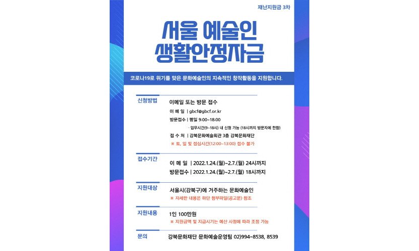 서울 강북구(구청장 박겸수)는 코로나19 장기화로 어려움을 겪는 예술인이 창작활동을 지속할 수 있도록 예술인에게 '서울 예술인 생활안정자금'(재난지원금 3차)을 지원한다…
