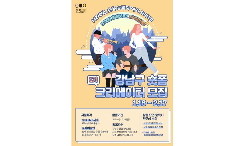 '기분 좋은 변화, 품격 있는 강남'을 실현 중인 서울 강남구(구청장 정순균)가 '숏폼 크리에이터' 1기를 18일부터 다음 달 17일까지 모집한다.짧은 영상을 의미하는 …