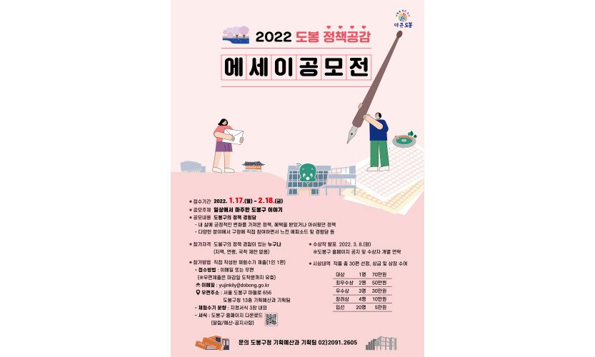 서울 도봉구(구청장 이동진)가 주민의 관점에서 가치있는 정책을 찾고, 정책 경험담을 기록·공유하기 위한 '도봉 정책공감 에세이 공모전'을 실시한다.공모기간은 1월 17일…