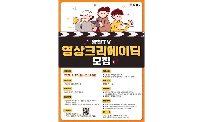 서울 양천구(구청장 김수영)가 지역주민이 직접 기획자가 돼 영상을 제작하는 '양천 TV 영상 크리에이터'를 모집한다.'양천 TV 영상 크리에이터'는 주민이 직접 기획부터…