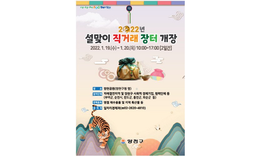 서울 양천구(구청장 김수영)가 민족 고유의 명절인 설을 맞이해 농가를 돕고 구민에게 신선하고 품질 좋은 지역특산물을 제공하고자 1월 19일부터 20일까지 이틀간 '설맞이…