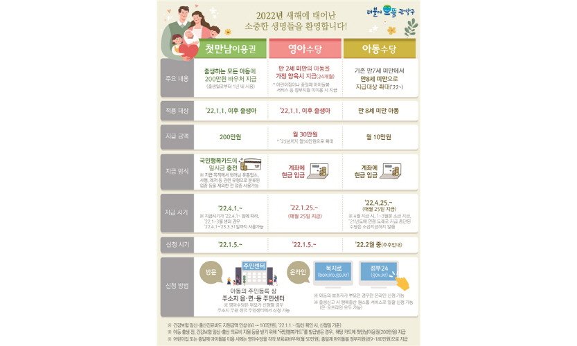 서울 관악구(구청장 박준희)가 2022년부터 태어나는 모든 신생아를 대상으로 첫만남이용권, 영아·아동 수당 등 영유아 관련 지원금을 대폭 신설, 확대한다.구는 최근 저출…