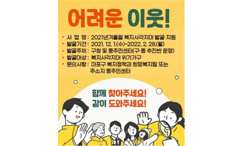 서울 마포구(구청장 유동균)가 겨울철 힘들고 외로운 이웃이 없도록 복지사각지대 발굴과 지원에 총력을 기울이고 있다.구는 장기화된 코로나19로 경제 위기가구가 증가하고 한…