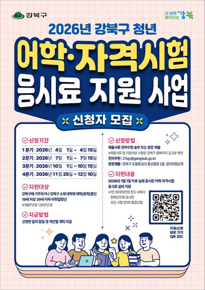 서울 강북구(구청장 이순희)는 미취업 청년의 취업 준비 비용 부담을 덜기 위해 ‘청년 어학·자격시험 응시료 지원 사업’을 전년보다 확대 시행하고, 총 900명을 모집한다. 이는 지난해보다 200명 늘어난 규모다.