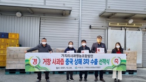 경남 거창군은 24일 가지리사과영농조합법인(대표 이복덕)에서 행복농촌과 김동석 과장을 비롯한 관계자 5명이 참석한 가운데 사과즙 중국 상해 수출 선적식을 했다.가지리영농…