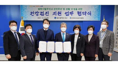 광주광역시 서구(구청장 서대석)가 지난 21일 북한이탈주민의 건강증진 및 생활 안정을 위해 한국건강관리협회 광주·전남지부(본부장 김계환)와 건강검진 지원 업무협약을 체결…
