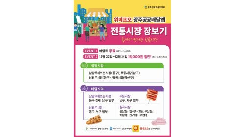 광주광역시는 위메프오 광주공공배달앱이 연말을 맞이해 22일부터 24일까지 전통시장 장보기 주문 고객을 대상으로 할인이벤트를 진행한다고 밝혔다. 이번 이벤트는 코로나19 장…