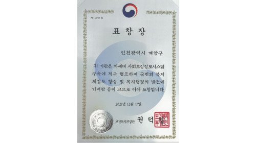 인천광역시 계양구는 지난 17일 보건복지부에서 주관한 2021년 차세대 사회보장정보시스템 구축기반 마련 유공 지자체로 선정돼 인천에서 유일하게 '보건복지부 장관' 표창을 받는 영예…