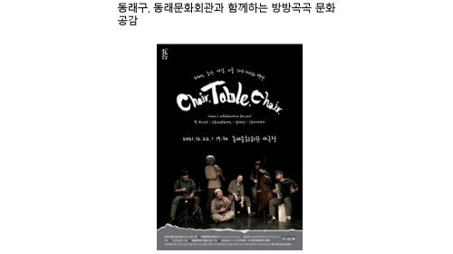 부산 동래문화회관 대극장에서 오는 12월 22일 수요일 오후 7시 30분 팀퍼니스트의 '체어, 테이블, 체어'를 공연한다.'체어, 테이블, 체어'는 서커스 밴드가 들려주는 의자와 …