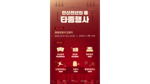 안산시(시장 이민근)는 오는 31일 오후 10시부터 화랑유원지 단원각에서 '2026 안산 천년의 종 타종 행사'를 개최한다고 30일 밝혔다.2025년 한 해를 마무리하고…