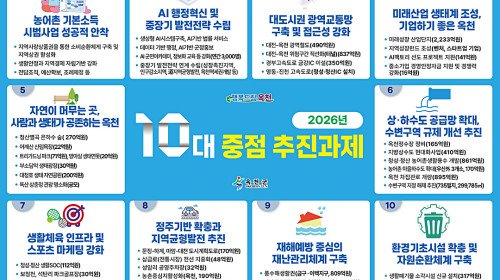 옥천군이 26일 2026년 군정 운영의 핵심 방향을 담은 10대 중점 추진과제를 발표하고, 군민 삶의 질 향상과 지속 가능한 지역성장을 위한 정책 추진에 나선다.이번에 …