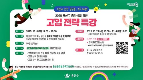 앞서 7월에는 수시모집 지원전략 특강과 수시대비 1:1 전략컨설팅을, 5∼6월에는 '2025학년도 대학입시 설명회', '대입 역량강화 특강', '찾아가는 용산진학'과 진학 심포지엄 '용산진학 길라잡이' 등을 개최한 바 있다.