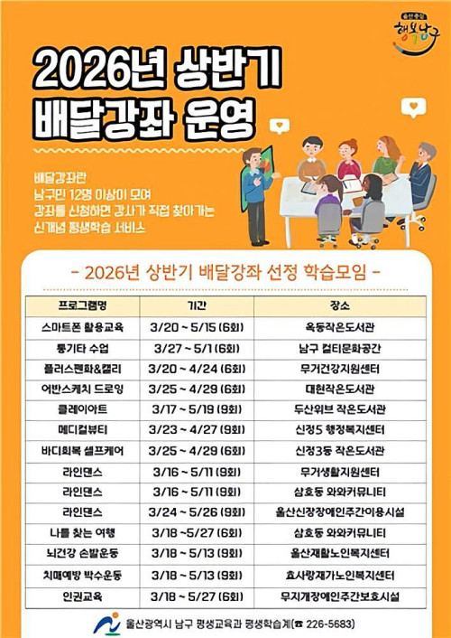 울산 남구(구청장 서동욱)는 지역 주민이 원하는 시간과 장소에서 배움을 이어갈 수 있는 수요자 중심 평생학습 프로그램 '2026년 상반기 맞춤형 배달강좌'를 운영한다고 17일 밝혔다.배달강좌는 일정 인원이 학습모임을 구성해 강좌를 신청하면 강사가 직접 찾아가 교육을 진행하는 맞춤형 평생교육 프로그램으로 시간과 공간의 제약 없이 생활 속에서 배움을 실현할 수 있는 남구 대표 평생학습 사업이다.올해 상반기에는 스마트폰 활용교육, 어반스케치, 클레이아트 등 실생활과 밀접한 분야의 강좌를 포함해 총 14개 학습팀이 선정돼 다양한 연령층의 주민들이 참여해 지역 곳곳에서 배움의 기회를 이어갈 예정이다.배달강좌는 아파트 커뮤니티 공간, 행정복지센터, 마을공동시설 등 주민 생활권 내 다양한 장소에서 운영되며, 주말과 저녁시간을 활용해 이웃과 함께 배움으로써 높은 만족도를 보여주고 있다.남구 관계자는 "배달강좌는 학습자가 원하는 곳에서 부담 없이 교육에 참여할 수 있도록 지원하는 평생학습 사업이다"며 "앞으로도 지역 주민들의 다양한 학습 수요를 반영해 누구나 참여할 수 있는 평생교육 기회를 확대해 나가겠다"고 전했다.