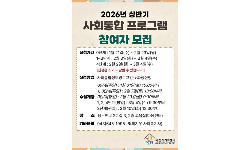 제천시가족센터는 지역에 거주하는 이민자들이 지역사회 구성원으로 안정적으로 정착하고, 문화 이해와 소통을 증진할 수 있도록 이달 31일부터 사회통합 프로그램을 운영한다.올…
