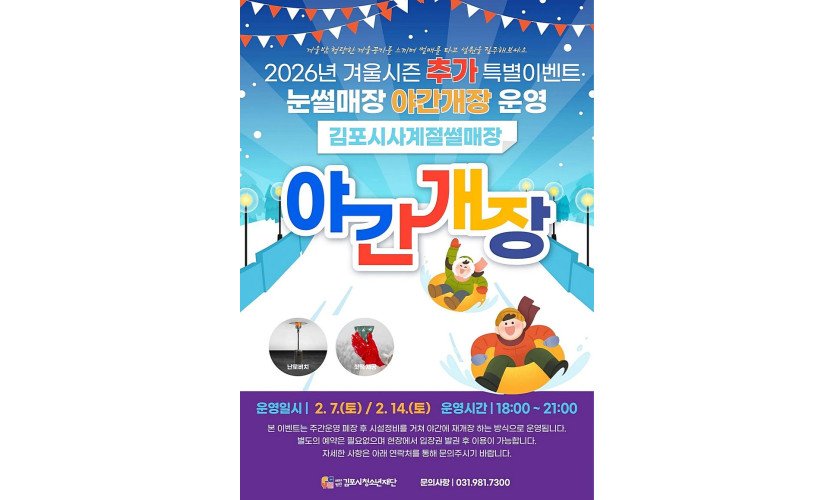 김포시는 겨울철 야간 여가문화 확대와 시민 만족도 제고를 위해 2026년 겨울시즌 야간개장 프로그램 '눈 내리는 은빛 썰매장'을 운영한다고 밝혔다.이번 야간개장은 2월 …
