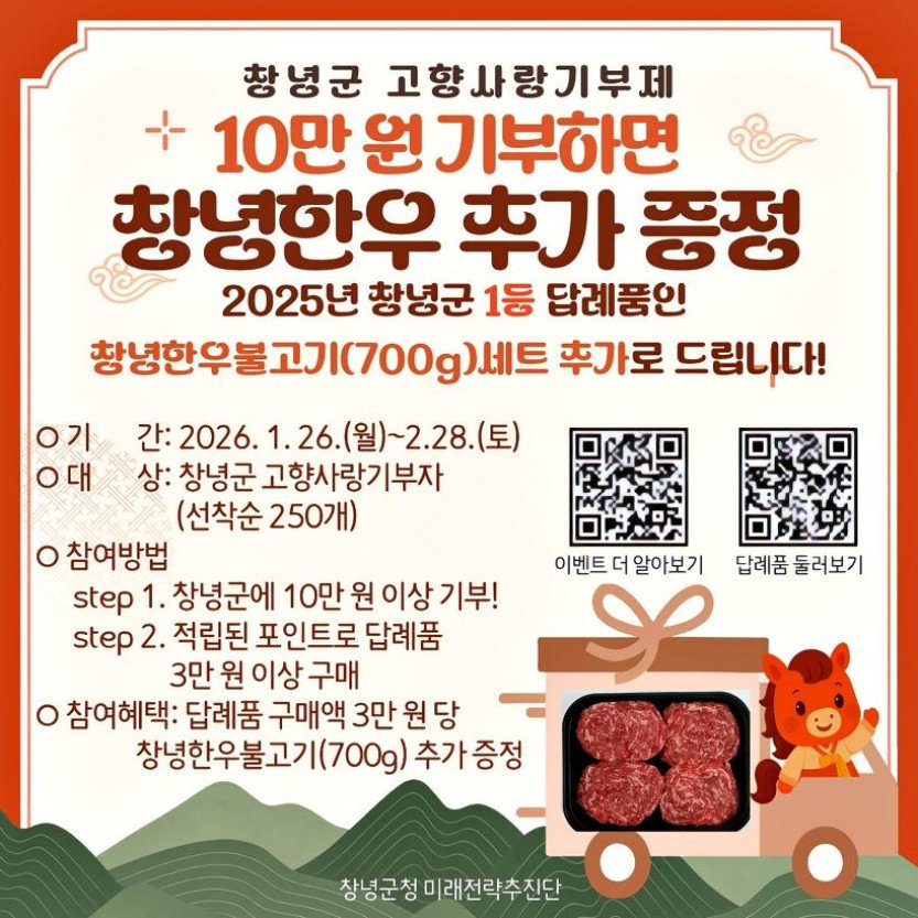 올해부터 고향사랑기부제 세액공제 10만∼20만 원 기부 구간이 신설되면서 기부자 혜택이 확대됨에 따라, 창녕군은 설 명절을 앞두고 '창녕한우 추가 증정 이벤트'를 마련했…