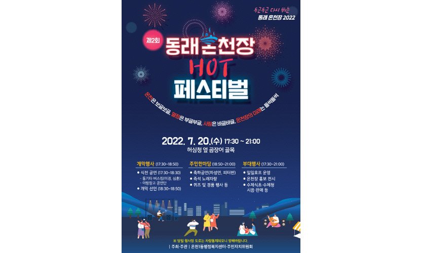 부산 동래구 온천1동(동장 이경아)에서 오는 7월 20일, 코로나19 이후 3년 만에 '제2회 동래 온천장 HOT 페스티벌'이 열린다.온천1동 행정복지센터와 주민자치위원…