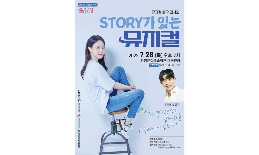 함양군 문화시설사업소(소장 김연옥)는 문화가 있는 날 천원의 행복음악회 7월 행사로 오는 28일 오후 7시 함양군문화예술회관 대공연장에서 '뮤지컬 배우 리사의 스토리가 …