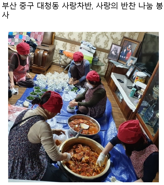 부산 중구 대청동 사랑차반(회장 장영란)은 지난 10일 관내 저소득가구 26세대를 대상으로 직접 만든 반찬(육개장, 고등어조림, 달걀말이, 시금치 등)을 전달하는 사랑의 반찬 나눔 행사를 했다.
