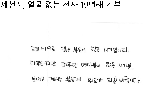 충북 제천시에 '얼굴 없는 천사'의 기부가 올해로 19년째 이어지고 있어 주위를 훈훈하게 했다.
