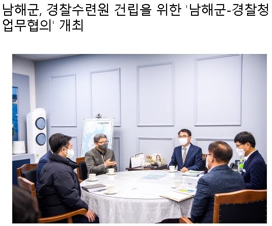 국내 최대 규모 경찰수련원 남해 유치 확정 후 열린 첫 실무 협의 자리로 향후 '부지 선정 절차'와 '사업추진 방식' 등에 대한 의견 조율이 이루어졌다.