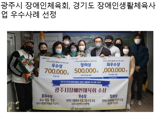 경기 광주시는 최근 경기도장애인체육회가 실시한 '2021년 장애인생활체육 우수사례 공모전' 총 3개 부문에서 광주시장애인체육회가 우수사례로 선정됐다고 14일 밝혔다.