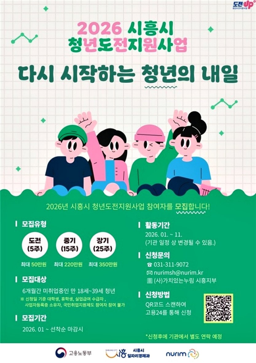 시흥시는 취업과 사회 진출에 어려움을 겪고 있는 청년들의 재도전을 지원하기 위해 '2026년 청년도전지원사업' 참여자 156명을 모집한다.'청년도전지원사업'은 장기간 취…