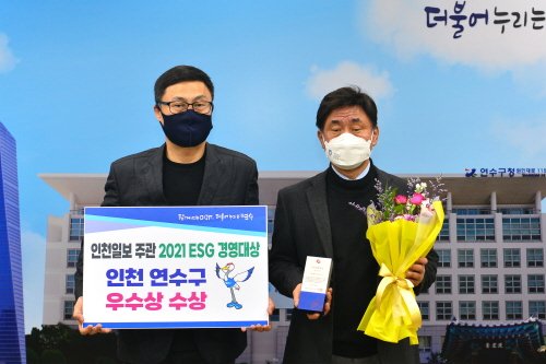연수구는 지난 21일 인천일보 주관 2021. 제1회 ESG 경영 대상 공공부문(지방자치단체)에서 우수상을 받았다.