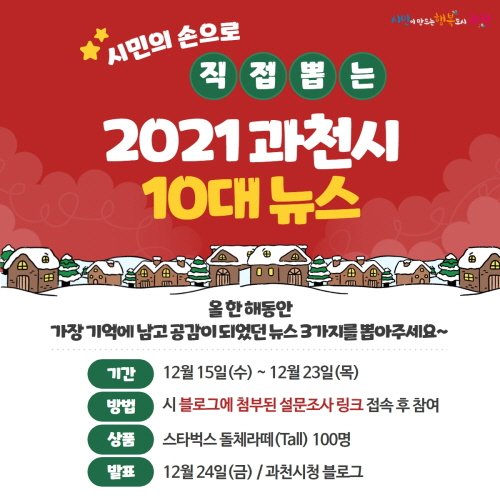 경기 과천시가 올 한해 추진한 주요 정책 중 시민들이 가장 공감하고 화제가 됐던 10대 뉴스 선정을 위한 설문 조사를 실시하고 있다.