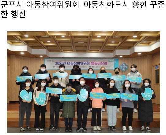 아동친화도시를 추진하고 있는 군포시는 지난 9월 유니세프 아동친화도시 인증을 신청했으며 내년 상반기 안으로 인증을 받을 것으로 기대하고 있다.