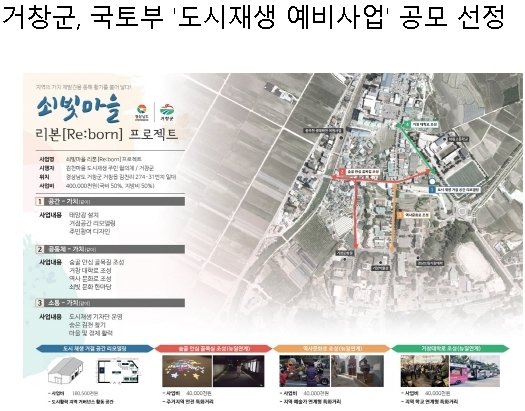 경남 거창군은 국토교통부에서 실시한 '2022년 도시재생예비사업 공모'에 거창군김천지구 '쇠빛마을 리본(Re:born)프로젝트' 사업이 지난 16일 최종 선정됐다고 밝혔다.