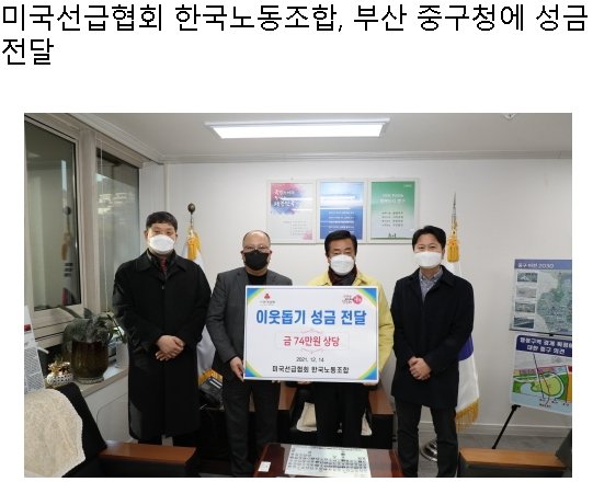 미국선급협회 한국노동조합(위원장 최규진)은 지난 14일 부산 중구청(구청장 최진봉)을 방문해 관내 취약계층을 위해 성금 74만 원을 전달했다.