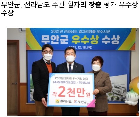 전남 무안군은 전라남도 주관 2021년 일자리 창출 우수시군 평가에서 우수상을 받아 인센티브 1,000만 원과 기관표창을 받았다고 밝혔다.