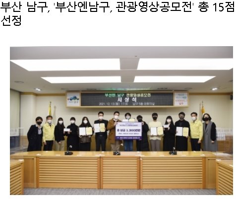 부산 남구(구청장 박재범)는 남구를 방문을 유도하는 우수한 관광홍보 창작 영상물을 얻고자 전국단위의 '부산엔남구 관광영상공모전'을 시행해 총 15점(대상 1, 최우수 2, 우수 2, 장려 10)을 선정하고 지난 12월 13일 남구청 5층 대회의실에서 시상했다.