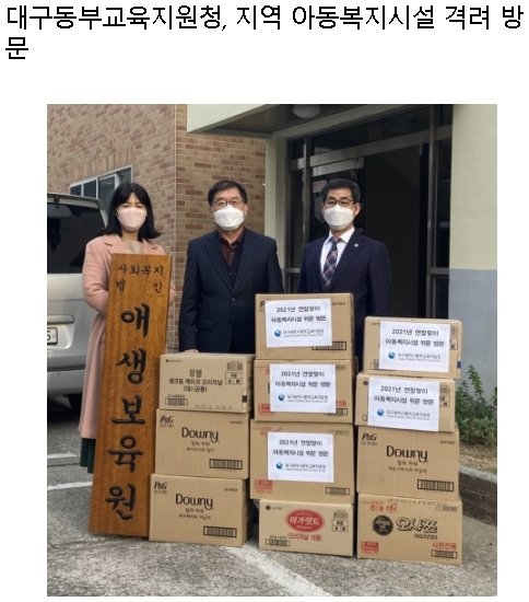 대구동부교육지원청(교육장 정병우)은 연말을 맞아 이달 16일, 17일 양일간 지역 아동복지시설인 애생보육원(동구 방촌로 소재) 및 봄의집(수성구 들안로 소재)을 방문해 시설 운영에 필요한 생필품을 전달하며 이웃사랑을 실천했다.