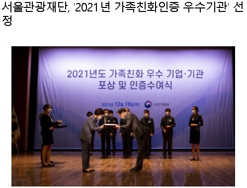 서울관광재단(대표이사 길기연)은 16일 여성가족부가 주최한 '2021 가족친화인증 및 정부포상 수여식'에서 '가족친화인증 우수기관'으로 선정됐다고 밝혔다.