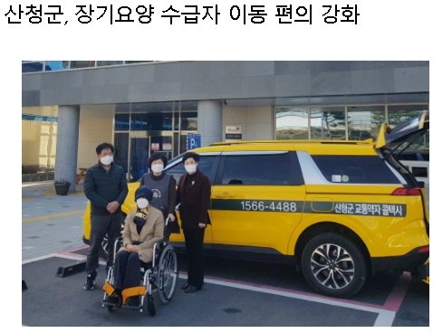 17일 산청군에 따르면 어르신 등 장기요양 수급자의 이동 편의를 위해 특별교통수단(교통약자 콜택시) 운행 시 요양보호사가 동행하는 장기요양 이동지원서비스 시범사업을 시행한다.