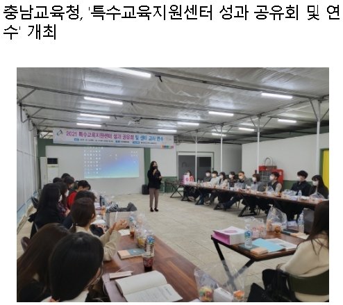 충청남도교육청(교육감 김지철)은 16일, 17일 양일간에 걸쳐 아산 로뎀농원 세미나실에서 '2021 특수교육지원센터 성과 공유회 및 연수'를 실시하고 2022학년도 특수교육지원센터 운영 방안 등을 논의한다.