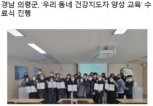 경남 의령군(군수 오태완)은 지난 15일 의령군보건소 주관으로 '우리 동네 건강지도자 양성 교육' 수료식을 진행했다고 밝혔다.