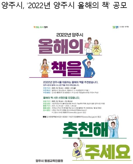 경기 양주시(시장 이성호)는 오는 2022년 1월 21일까지 책으로 하나 되는 '책 읽는 도시 양주' 조성을 위해 '2022년 양주시 올해의 책'을 추천받는다.