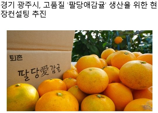 한편, 광주시 농업기술센터는 지난 2018년과 2019년도에 광주시 퇴촌면, 남종면을 중심으로 신소득작목 감귤을 시범 도입해 재배에 성공했으며 올해는 농산물 브랜드 '팔당愛감귤'을 개발, 팔당 상수원의 깨끗한 물과 맑은 공기가 키워낸 명품 농산물로 소비자에게 각인될 수 있도록 힘쓰고 있다.