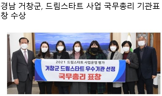 경남 거창군은 지난 14일 보건복지부 주관 2021년도 드림스타트 사업 평가에서 우수기관에 선정돼 국무총리 기관표창을 수상했다.
