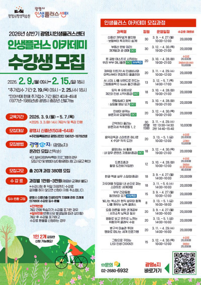 광명시 인생플러스센터, ‘2026년 상반기 인생플러스 아카데미’ 수강생 380명 모집