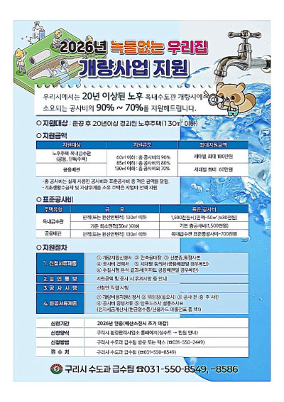 구리시, 2026년 녹물 없는 우리 집 수도관 개량 사업 신청 접수