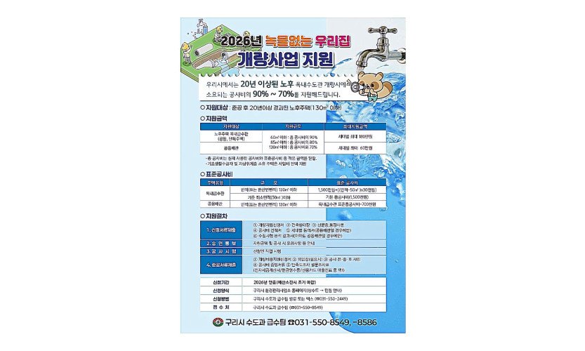 구리시(시장 백경현)는 2026년 수도관 개량 공사비 지원 사업의 신청을 오는 2월 2일부터 접수한다고 밝혔다.수도관 개량 공사비 지원 사업은 녹물 발생으로 수도관 사용…