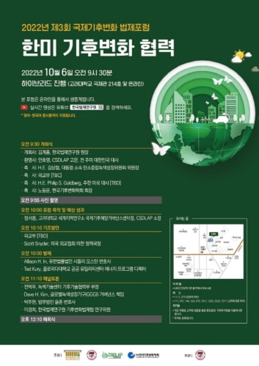 고려대학교(총장 정진택) 세계지역연구소 기후환경법정책센터는 10월 6일 오전 9시 반부터 '기후변화 대응을 위한 한미기후변화 협력'을 주제로 세미나를 개최한다.이번 행사…