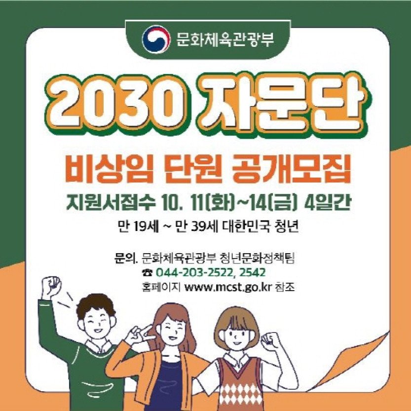 문화체육관광부(장관 박보균, 이하 문체부)는 개성과 창의성을 바탕으로 대한민국을 문화매력국가로 함께 만들어갈 청년세대 '2030 자문단'을 공모한다.정책적 동반자인 문체…