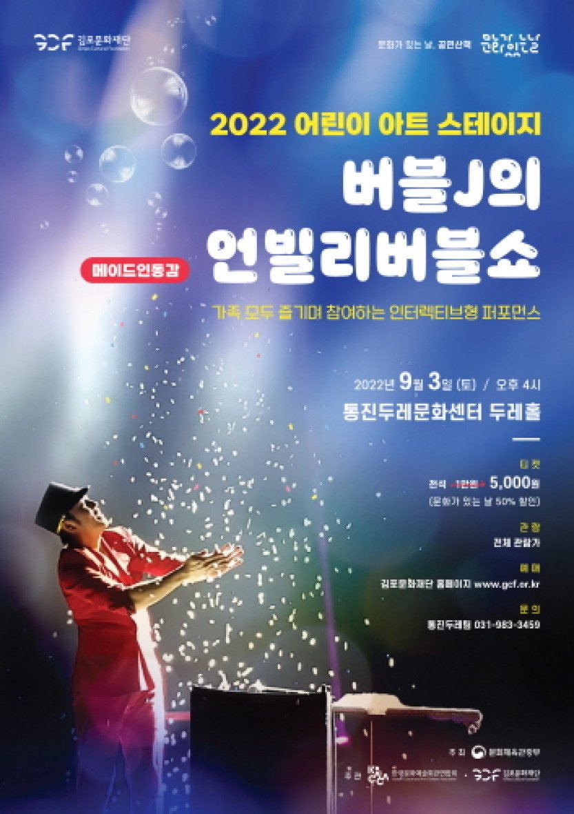 김포문화재단 통진두레문화센터에서는 오는 3일 '2022 어린이 아트 스테이지' '버블J의 언빌리버블쇼'를 선보일 예정이다.이번 어린이 아트 스테이지는 선선한 가을이 시작…