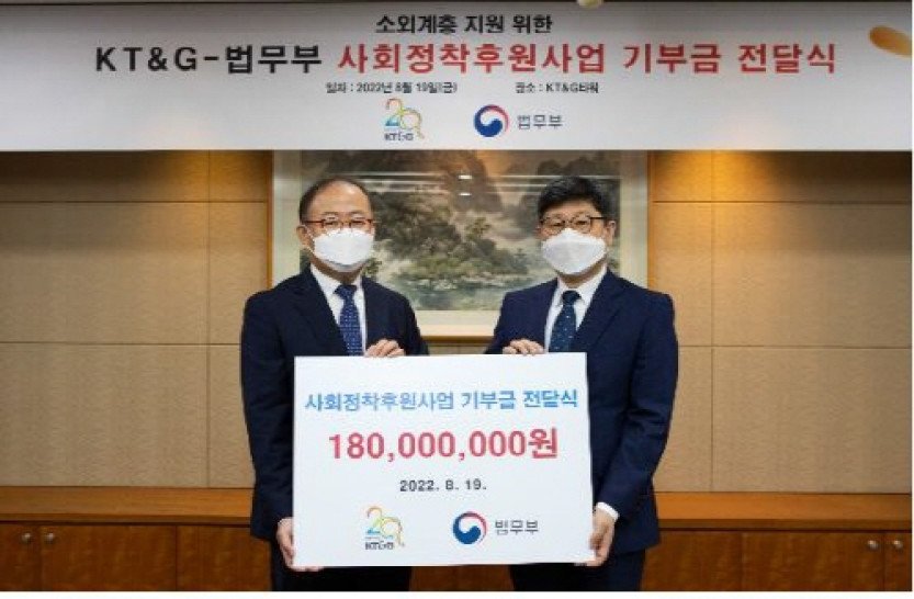 KT&G(사장 백복인)가 국립법무병원 환자의 치료·재활 및 법무보호대상자의 삶의 질 향상 등 사회정착후원사업을 지원하기 위해 법무부에 1억8,000만 원의 기부금…