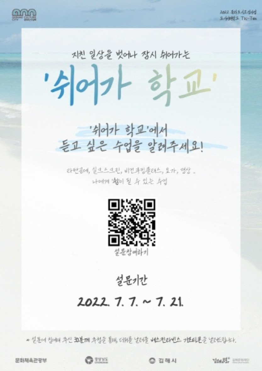 (재)김해문화재단 김해문화도시센터는 문화도시조성사업 도시미래학교 Tiki-Taka의 세부사업인 '쉬어가학교' 운영을 위해 김해 시민을 대상으로 수업 개설 수요조사 진행한…